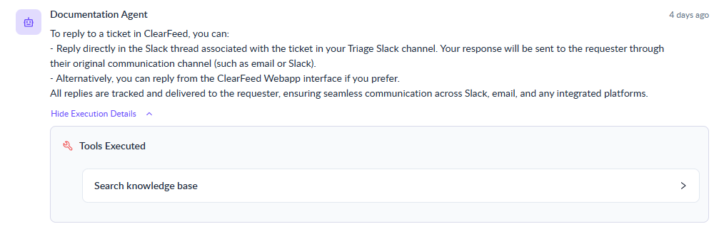 Every AI Agent response includes an expandable panel with the technical execution details. This includes: