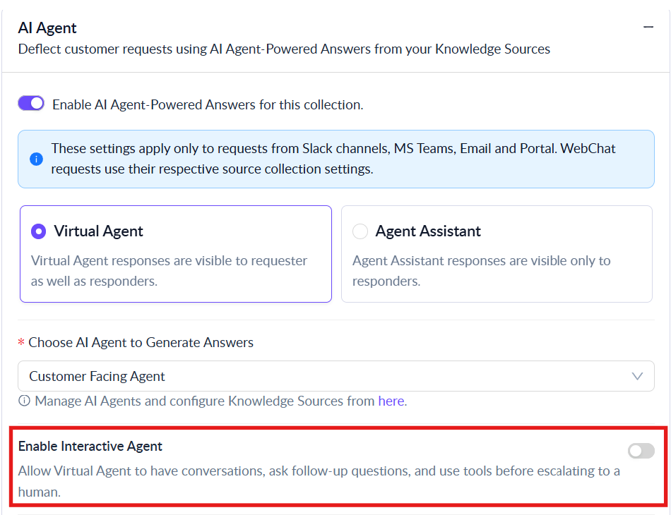 Each AI Agent can be configured per Collection, so different teams can tailor AI behavior, data access, and integrations to match their workflows.