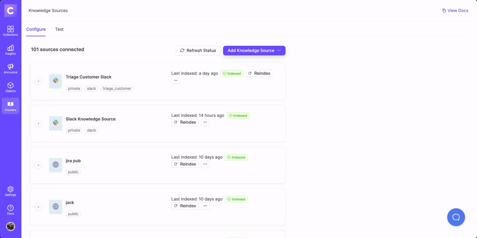 Once the status of the knowledge source has been indexed, learn more on how to manage the knowledge source below.