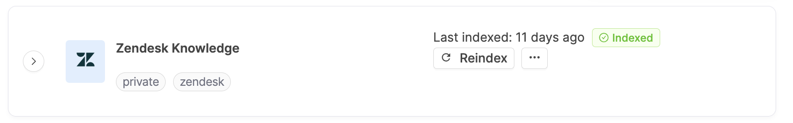 * **Reindexing Zendesk Docs -** To reindex Zendesk documents, manually reindex the knowledge source by clicking the "Reindex" button next to it.\\
