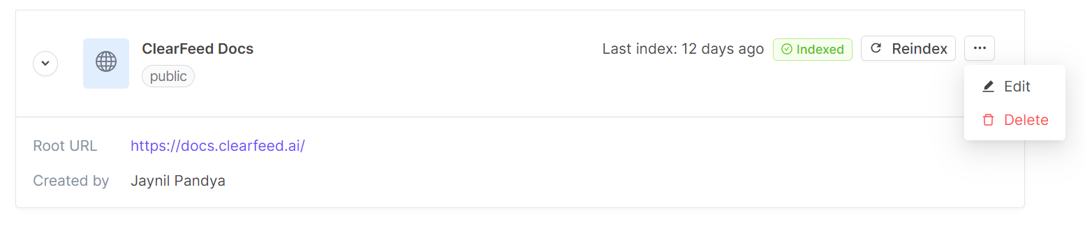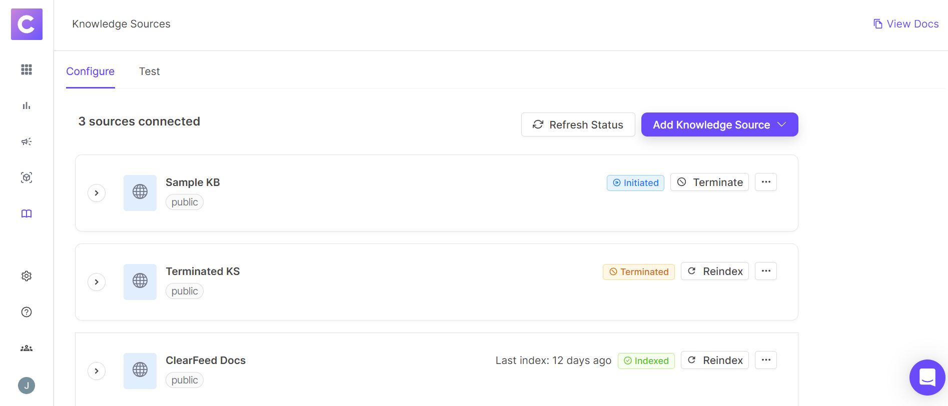 ClearFeed allows you to track the indexing statuses and manage all added Knowledge Sources. Navigate to the [Knowledge Sources](https://web.clearfeed.app/knowledge-sources) section on the web app, and get started!