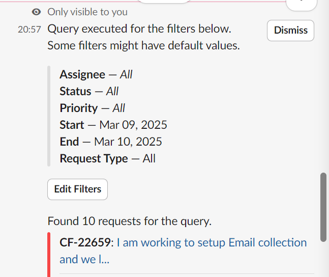 * Type /cf-query and your search query in plain English (e.g., "/cf-query Show me tickets from last week tagged as urgent").