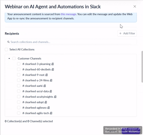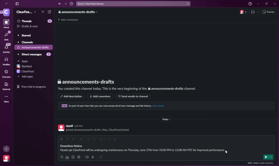 1. Create a dedicated Slack channel where your draft announcements will be prepared. eg. #clearfeed-announcements