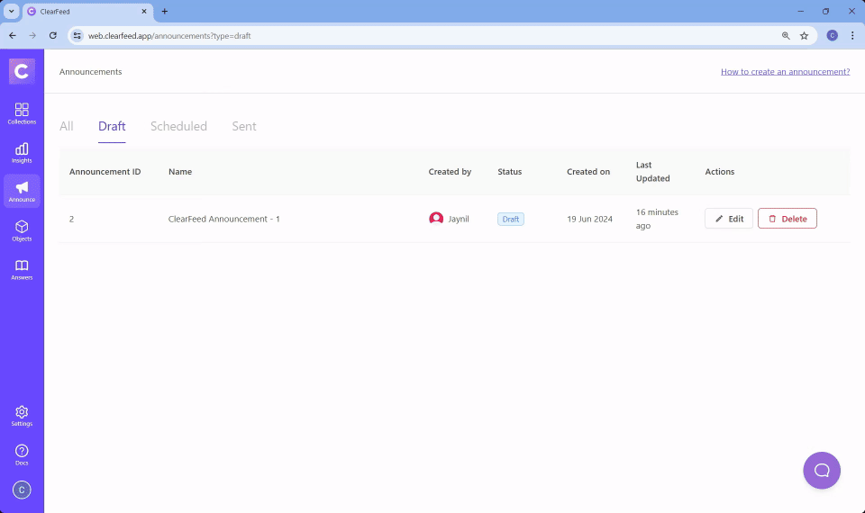 1. Go to <https://web.clearfeed.app/announcements> -> Draft -> Click on the Edit button against your announcement.