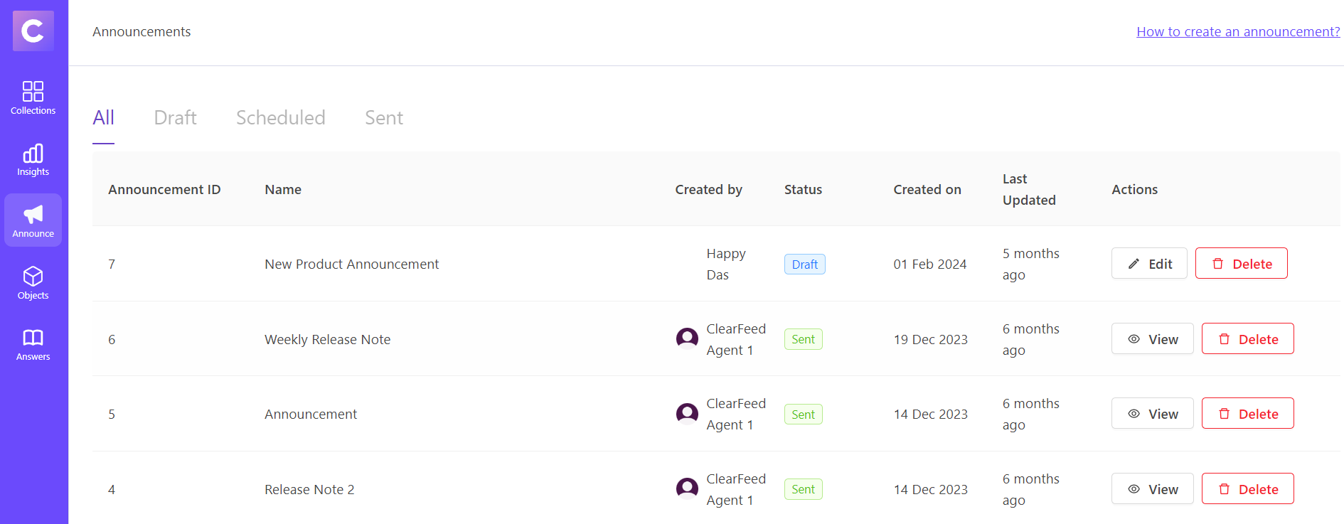 * **Draft**: Lists all drafted announcements that are yet to be sent or scheduled.