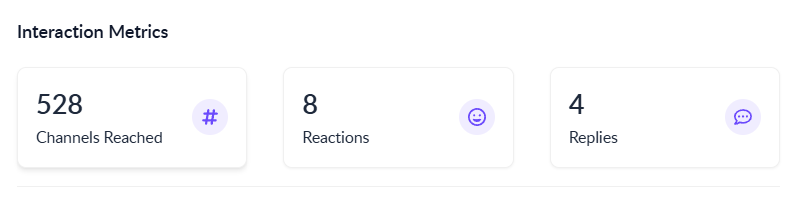 You can also view the number of reactions from each channel where the announcement was sent, along with the top reactions and the users who reacted. You can sort channels by reactions or replies, making it easy to identify which channels are engaging with the announcement.