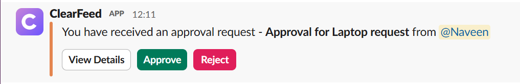 <figure><img src="https://3455705434-files.gitbook.io/~/files/v0/b/gitbook-x-prod.appspot.com/o/spaces%2FE2O2wTaNovd6fXpEuLKz%2Fuploads%2Fgit-blob-2ba6617d9e259b9fa1c330325b176e67e6fd9d9a%2FScreenshot%202025-07-16%20141558.png?alt=media" alt="" width="563"><figcaption><p>Notification to First Approver via ClearFeed App for Approval</p></figcaption></figure>