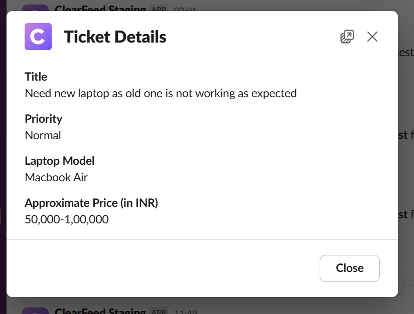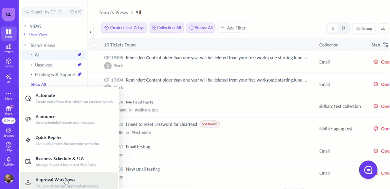 Approval Workflows help you manage structured decision-making on ticket requests such as expense sign-offs, IT access approvals, onboarding processes, or compliance-related reviews. ClearFeed allows you to define multi-level approval chains, notify approvers directly in Slack, and track every approval action inside the ticket.