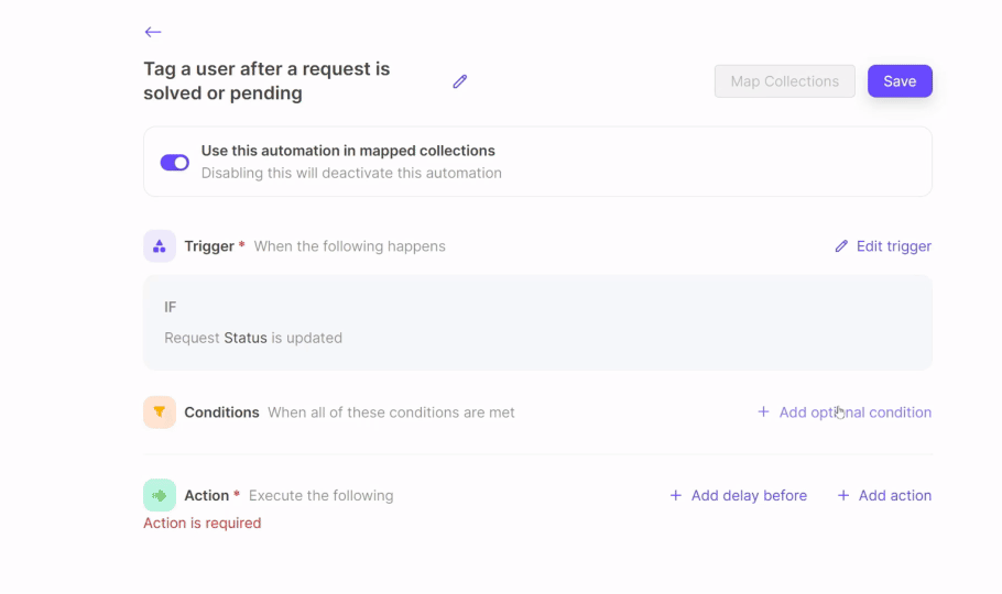 Let’s say you're setting up an automation to send a follow-up message to the Assignee if the **Status of the request** remains "Open" for 3 days. You set a delay of 3 days before sending the message.