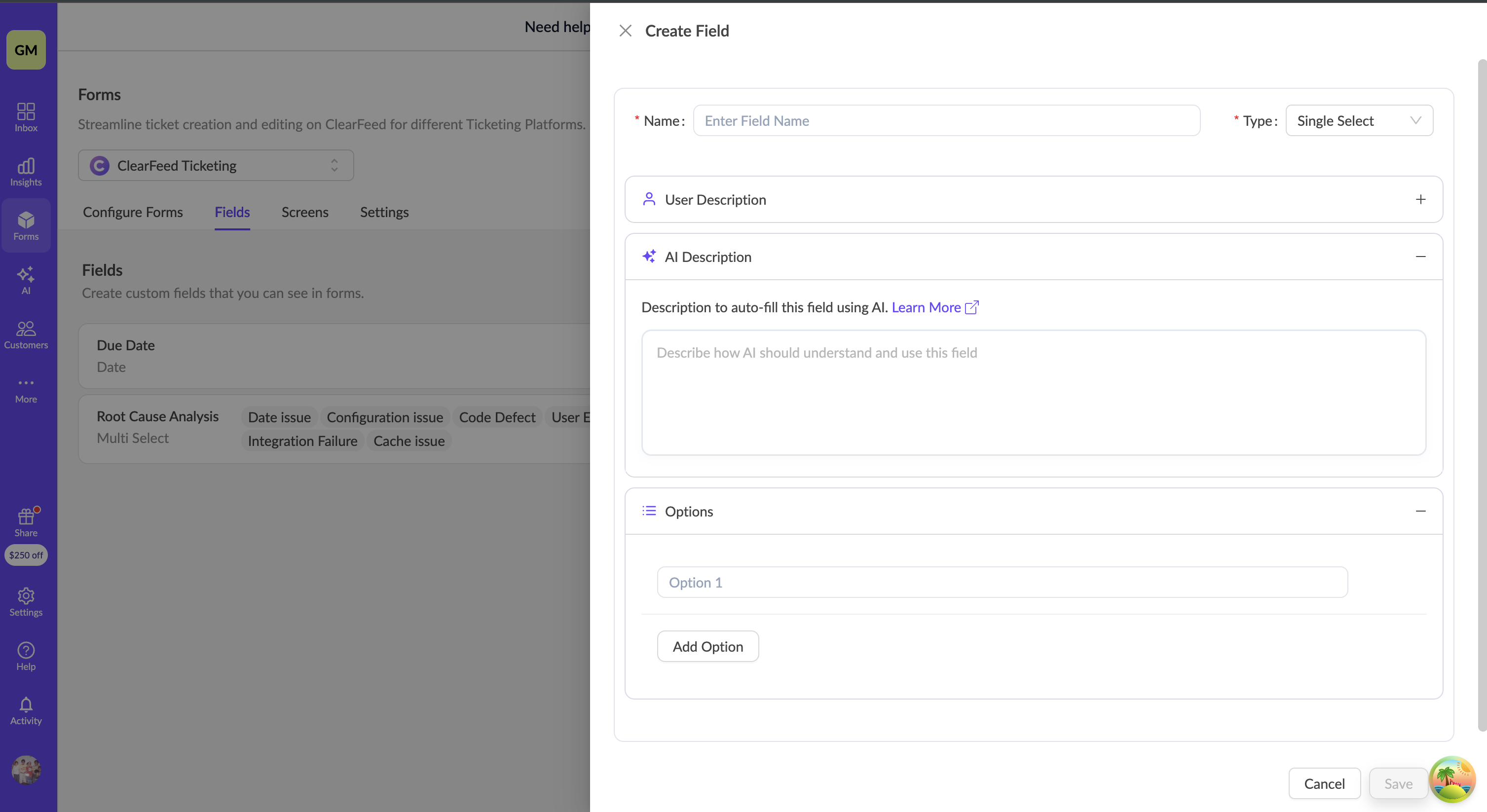 * **(Optional) Add** **AI Description** — Used to auto-fill this field with AI. Provide guidance on how AI should interpret and use this field. Available for all field types (except User select)