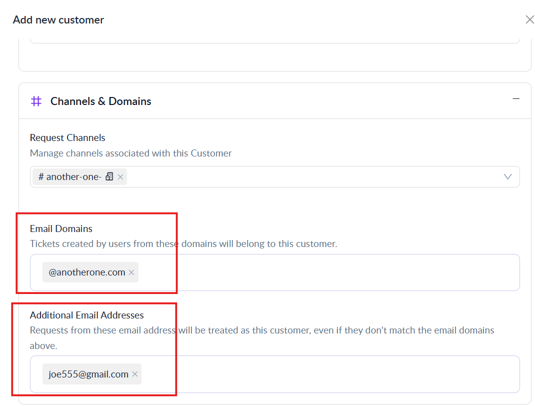 Domains are the primary method ClearFeed uses to identify which customer a request belongs to. You can also associate individual email addresses with a customer, including addresses from free email domains (e.g., `gmail.com`, `yahoo.com`).