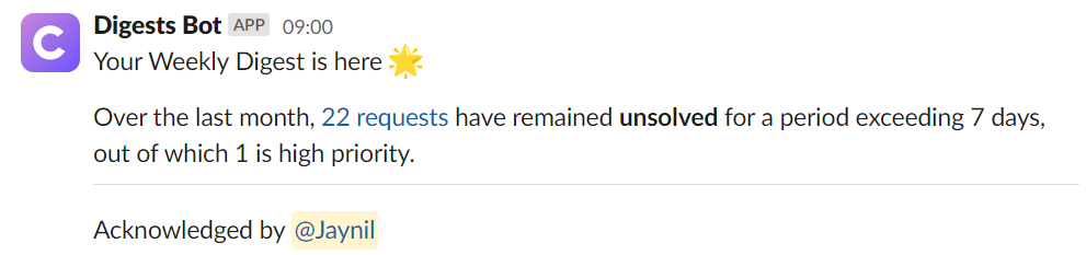 **Personal Weekly Digest -** You'll receive a Personal Weekly Digest, every Monday at 9:00 AM as a DM through the ClearFeed App that highlights requests assigned to you and have remained unsolved for the period between 14 and 7 days ago, helping you identify and prioritize older tasks that require your attention.