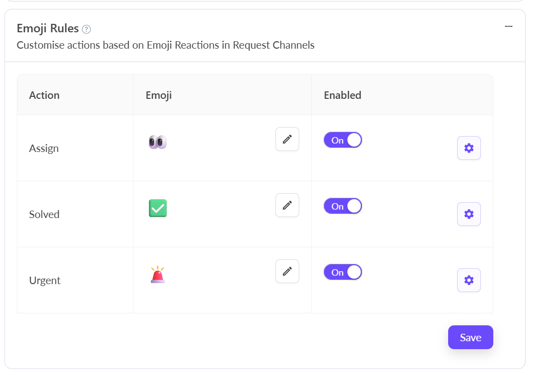 <table><thead><tr><th width="149.00003051757812">Action</th><th width="140.6666259765625">Emoji</th><th>Description</th></tr></thead><tbody><tr><td>Assign</td><td><span data-gb-custom-inline data-tag="emoji" data-code="1f440">👀</span></td><td>Assigns the request to yourself</td></tr><tr><td>Solved</td><td><span data-gb-custom-inline data-tag="emoji" data-code="2705">✅</span></td><td>Marks the request as resolved</td></tr><tr><td>Urgent</td><td><span data-gb-custom-inline data-tag="emoji" data-code="1f6a8">🚨</span></td><td>Sets the request priority to "Urgent"</td></tr></tbody></table>