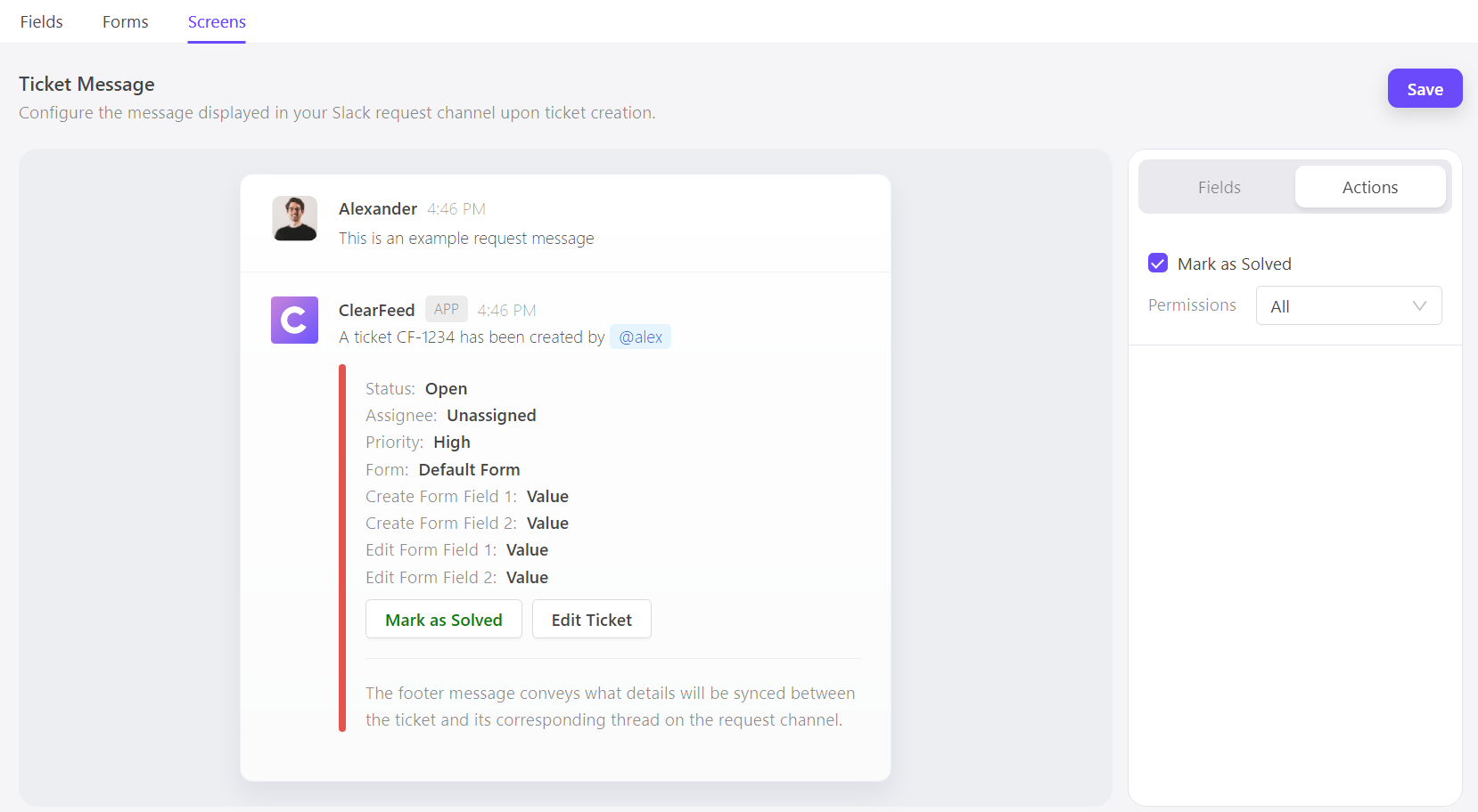 * **Note**: Only users with the specified permission for a field will see it in the form when creating a ticket on Slack. However, they must mandatorily fill it to proceed.