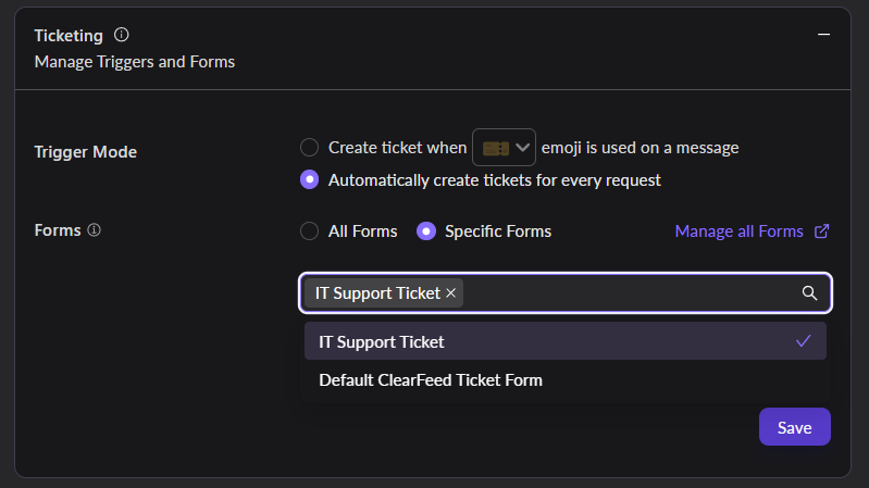 By default, all active ClearFeed Forms are available for ticket creation in Collections with ClearFeed ticketing enabled. However, you can map specific Forms to a Collection to restrict the available Forms for ticket creation.