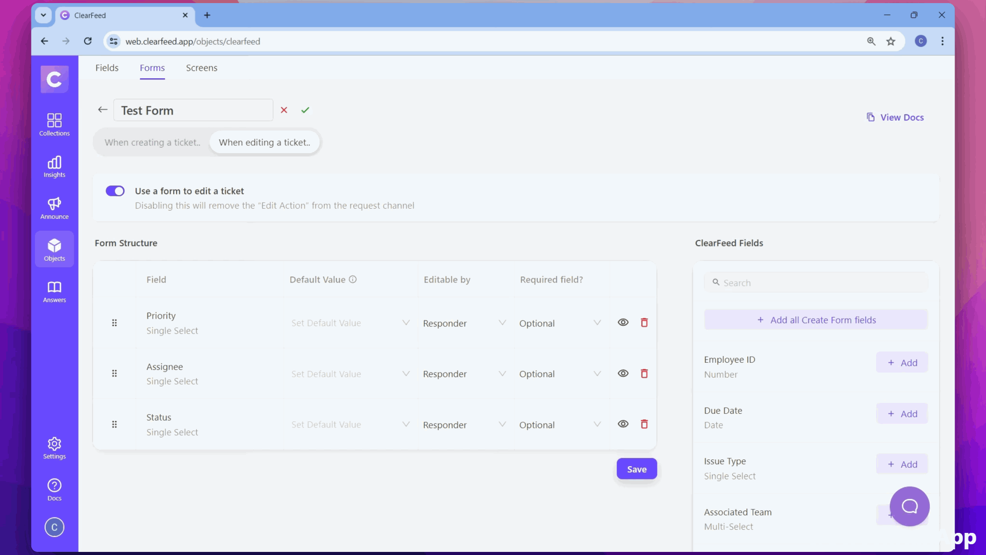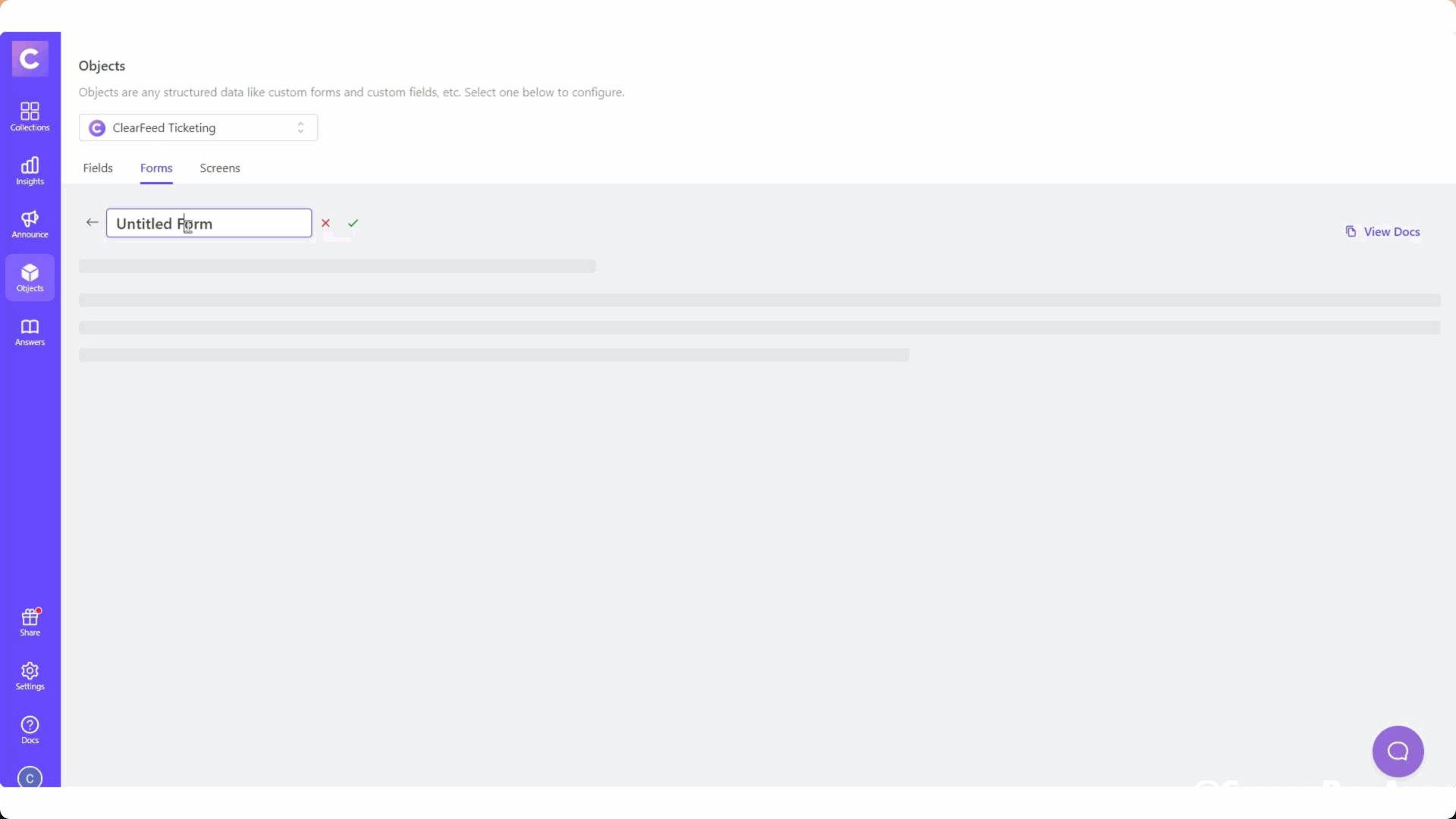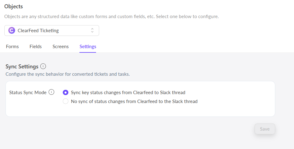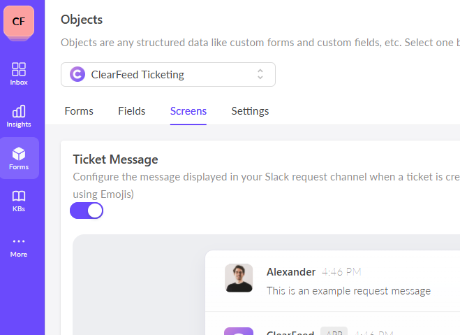* Head over to [Forms](https://web.clearfeed.app/objects/clearfeed) and switch to the Screens tab