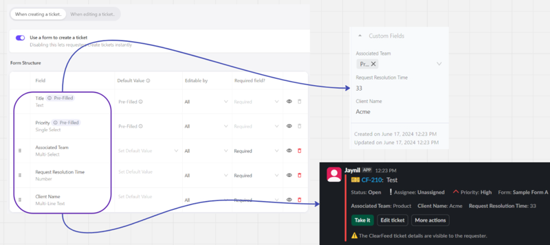 ClearFeed Ticket Forms include fields like Title, Priority, and Assignee. **To add custom fields, you must create them first.** Learn how to create them below: