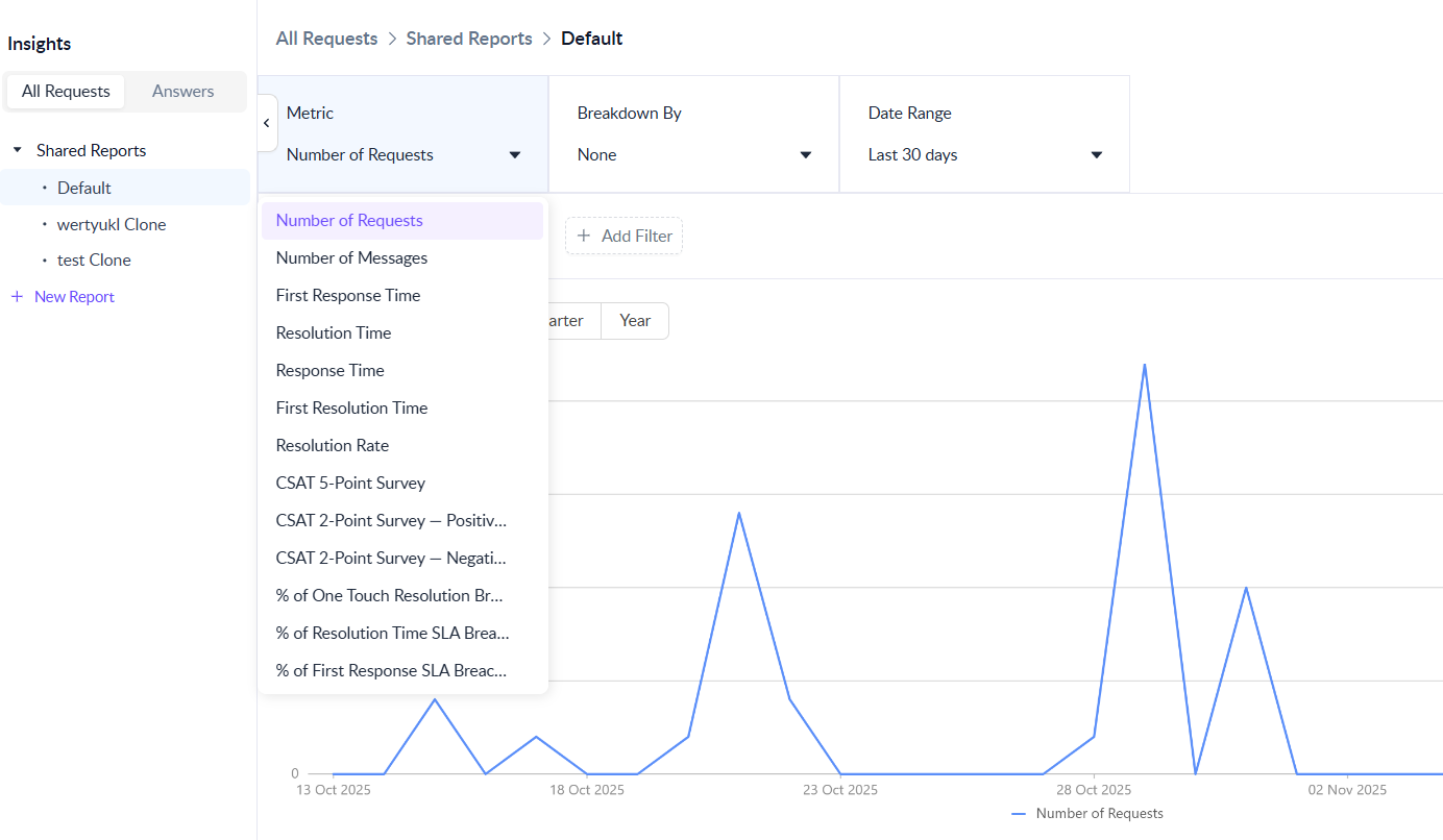 <table><thead><tr><th width="189.00006103515625">Requests</th><th>CSAT Metrics</th><th>SLA Metrics</th><th>Answers</th></tr></thead><tbody><tr><td><a href="#number-of-requests">Number of Requests</a></td><td><a href="#csat-5-point-survey">CSAT 5-Point Survey</a></td><td><a href="#of-first-response-sla-breached">% of First Response SLA Breached</a></td><td><a href="#number-of-interactions">Number of Interactions</a></td></tr><tr><td><a href="#number-of-messages">Number of Messages</a></td><td><a href="#csat-2-point-survey-positive-responses">CSAT 2-Point Survey - Positive Responses</a></td><td><a href="#of-resolution-time-sla-breached">% of Resolution Time SLA Breached</a></td><td><a href="#number-of-responses">Number of Responses</a></td></tr><tr><td><a href="#time-to-first-response">First Response Time</a></td><td><a href="#csat-2-point-survey-negative-responses">CSAT 2-Point Survey - Negative Responses</a></td><td><a href="#one-touch-resolution-breached">% One Touch Resolution Breached</a></td><td><a href="#number-of-generated-answers">Number of Generated Answers</a></td></tr><tr><td><a href="#resolution-time">Resolution Time</a></td><td></td><td></td><td><a href="#number-of-positive-feedback">Number of Positive Feedback</a></td></tr><tr><td><a href="#response-time">Response Time</a></td><td></td><td></td><td><a href="#number-of-negative-feedback">Number of Negative Feedback</a></td></tr><tr><td><a href="#first-resolution-time">First Resolution Time</a></td><td></td><td></td><td></td></tr><tr><td><a href="#resolution-rate">Resolution Rate</a></td><td></td><td></td><td></td></tr></tbody></table>