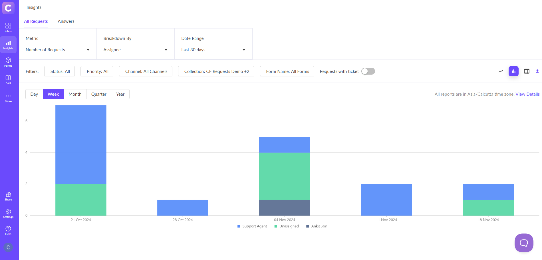 Our Insights feature offers detailed reporting to track request load, response times, and service levels. Use the 'Request' tab for agent-specific insights and the 'Virtual Agent' tab for Clearfeed Virtual Agent data. Metrics can be filtered by channel, responders, collections, and more. They can also be viewed within specific working hours, with options to download granular data for deeper analysis.