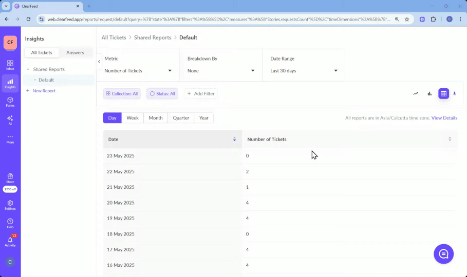<figure><img src="https://3455705434-files.gitbook.io/~/files/v0/b/gitbook-x-prod.appspot.com/o/spaces%2FE2O2wTaNovd6fXpEuLKz%2Fuploads%2Fgit-blob-4c947e182caba200224ae4e143cd2fb91b2f47d4%2Fimage%20(215)%20(1).png?alt=media" alt="" width="563"><figcaption><p>Insights page on the ClearFeed Web Dashboard</p></figcaption></figure>