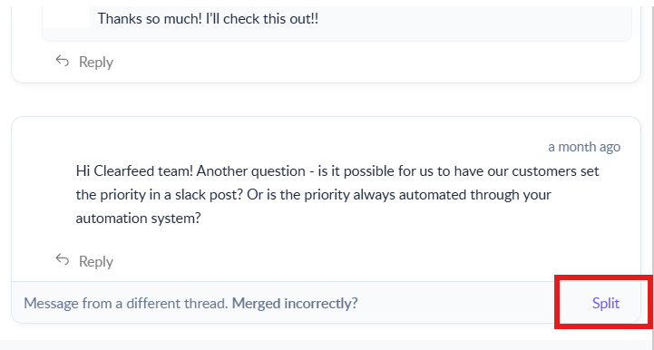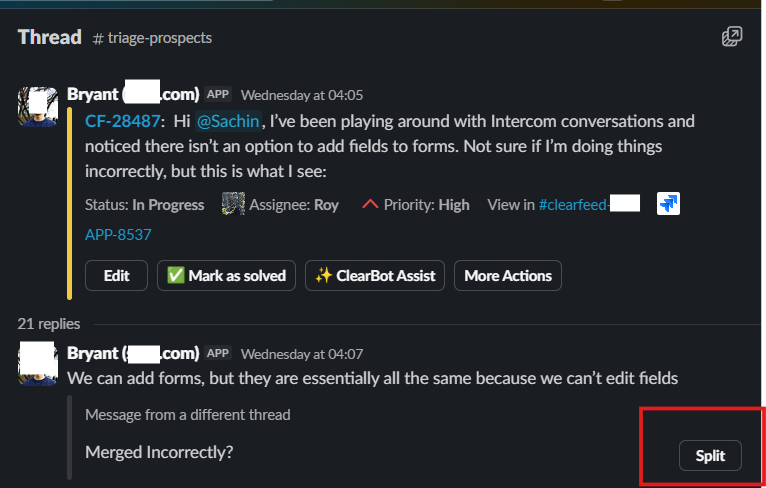 The image below shows an example of request with merged messages. The Split button is shown next to the merged message. Click on it would create a separate request out of the merged message - which would show up separately on Triage channels and ClearFeed WebApp dashboard.\\