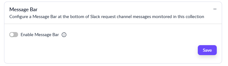 The **Message Bar** is a persistent action bar that appears at the bottom of Slack request channels. It provides one or more configurable action buttons that make it easy for users to file tickets or get AI-powered help without using slash commands or pinned instructions.