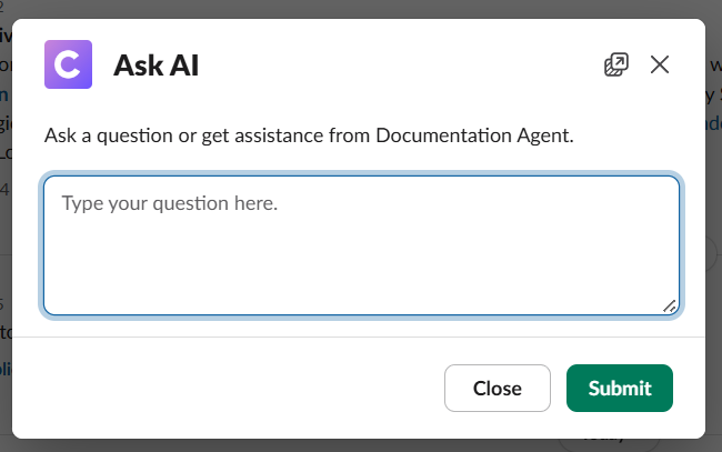 Clicking an action button opens the corresponding flow—ticket creation or Ask AI—without requiring slash commands or additional navigation.
