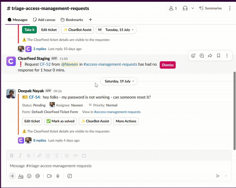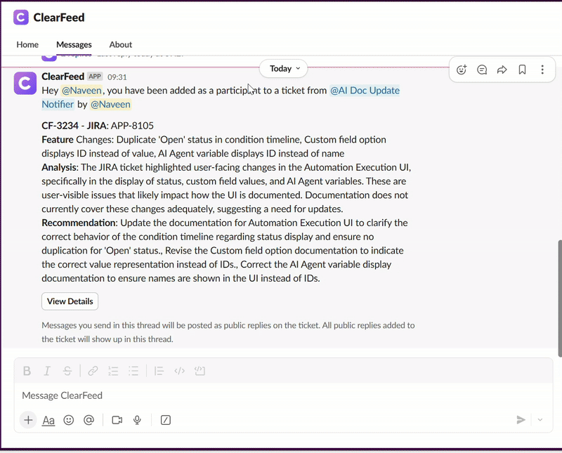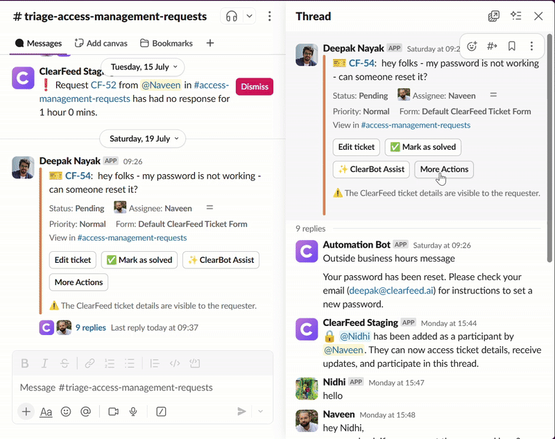 * Participant receives a DM from ClearFeed with request context and a collaboration thread.