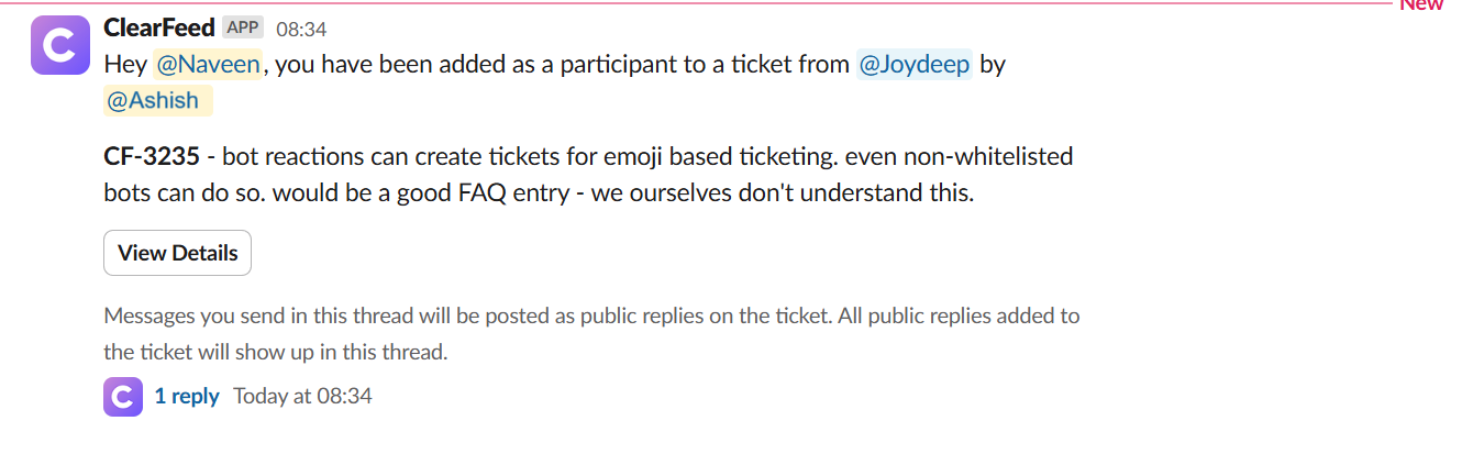 * When a new message is added, Participant as notified of the same in the DM thread from ClearFeed for the corresponding request.