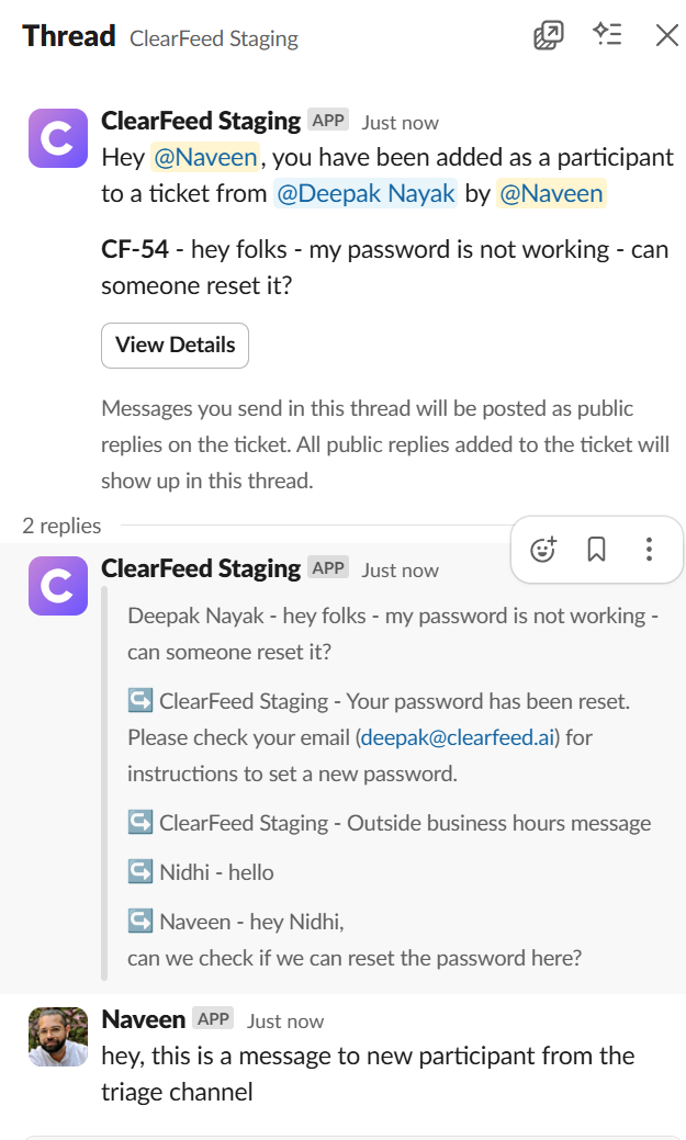 Any Slack user from the same workspace can be added as a Participant. Participants do not need to be created as agents in ClearFeed or members of the Triage channel.