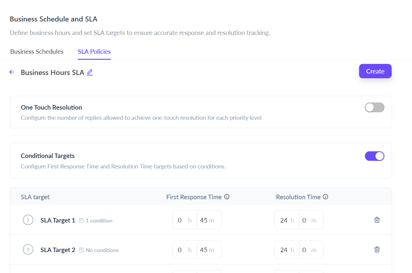 SLA (Service Level Agreement) Policies establish target timeframes for your team's response and resolution of support requests. These targets—**First Response Time**, **Resolution Time** and **One Touch Resolution**—are calculated based on the Business Schedule associated with each Collection.