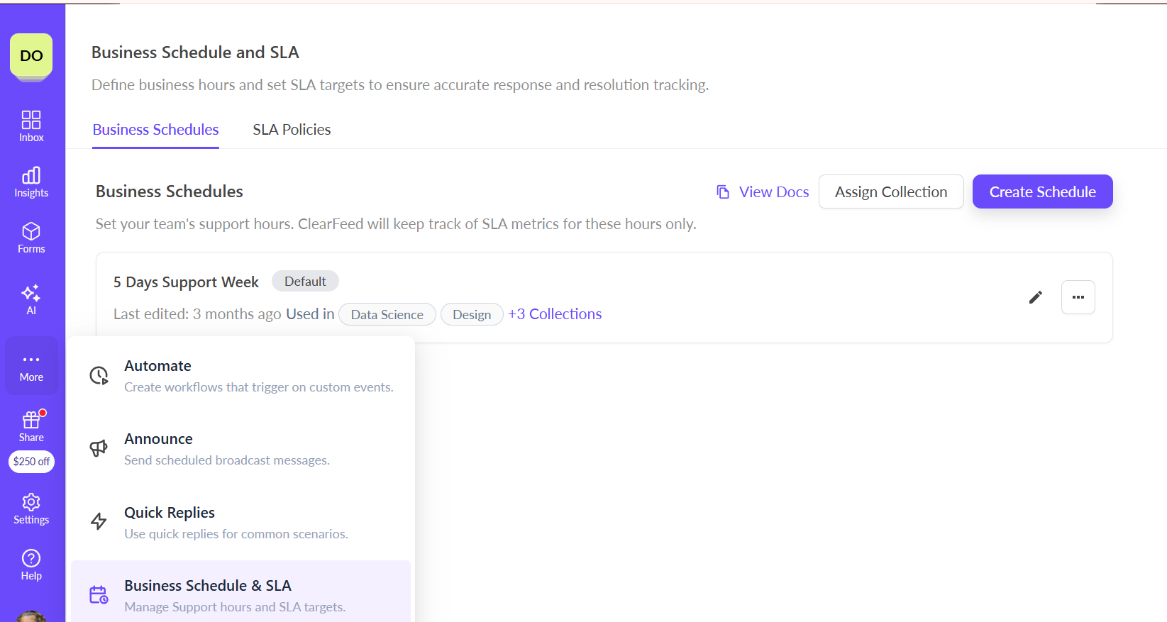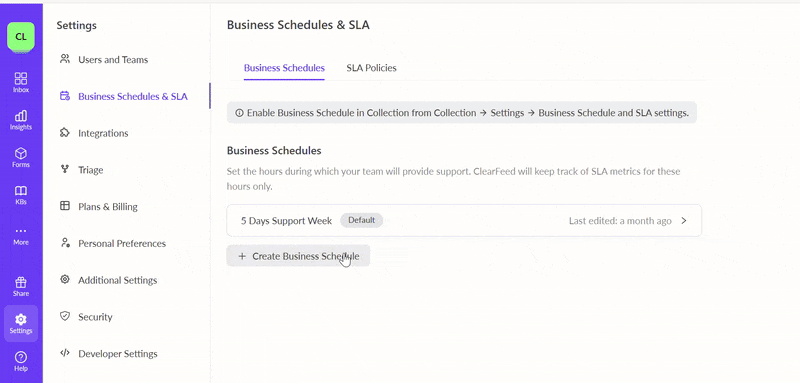 * Navigate to **More → Business Schedule & SLA** from the left navigation bar in the ClearFeed Web App