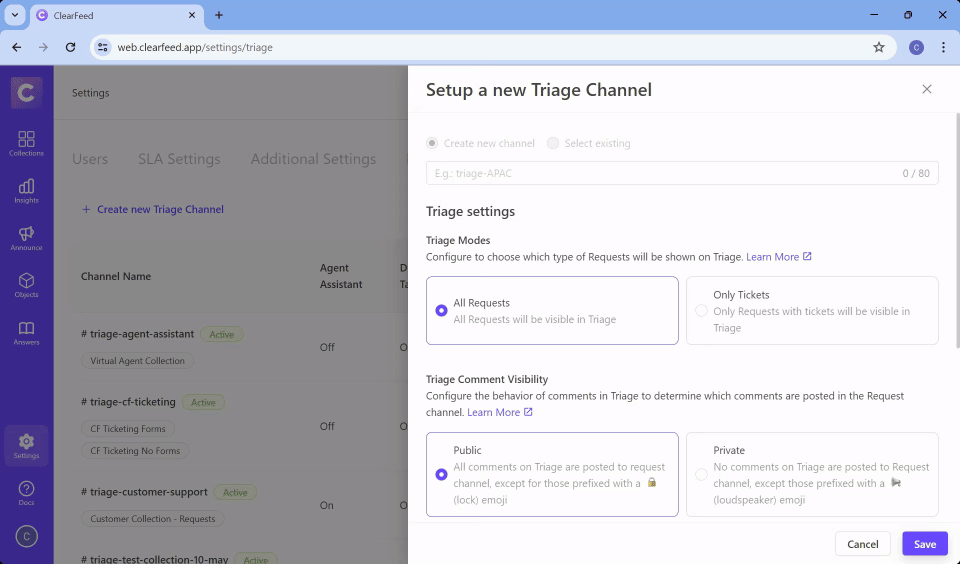This guide covers how to set up, configure, and manage Triage Channels in ClearFeed. For information on how to use triage channels as an agent, see [Triage Channel](https://docs.clearfeed.ai/clearfeed-help-center/managing-requests/triage-channel).