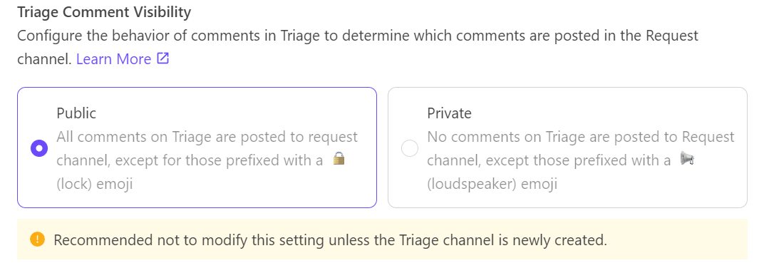 * **Private:** By default, no comments from the Triage Channel will be synced to the request channel, *except* for those prefixed with a 📢 emoji. These 📢 comments will be explicitly synced externally.