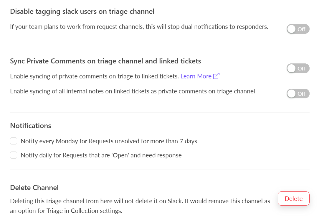 * Choose whether to sync all internal notes from linked tickets as private comments on the Triage Channel