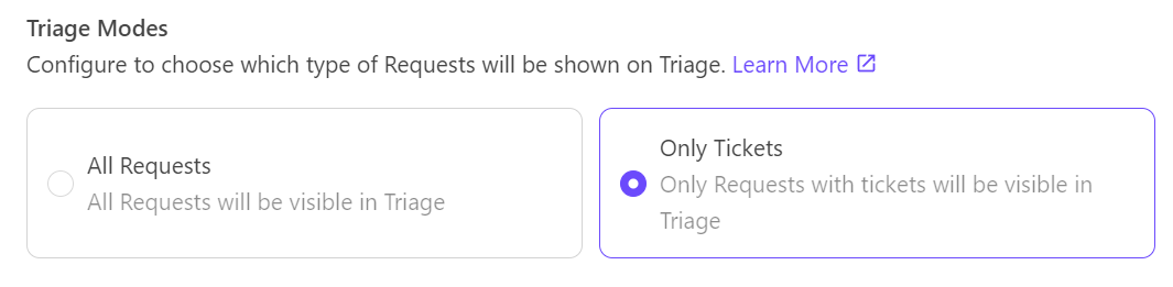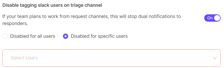 Enable this option to prevent users from being tagged in triage channels. This helps avoid duplicate notifications when a user is already tagged in the original request channel.