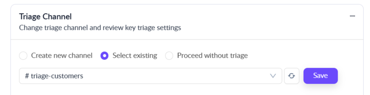 * Select **"Select existing"** to designate an existing Slack channel as a Triage Channel