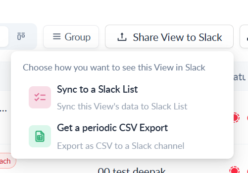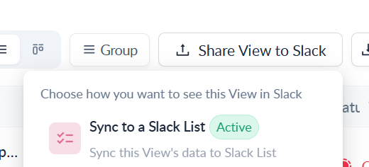 * The **Sync to a Slack List** option under the **Share View to Slack** dropdown will display an **Active** tag.\\