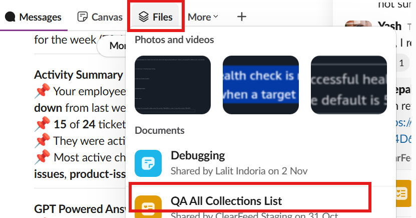 After scheduled sync, the generated list will appear under **Files** in the selected Slack channel containing the latest data from your Custom View. A suggested configuration is: