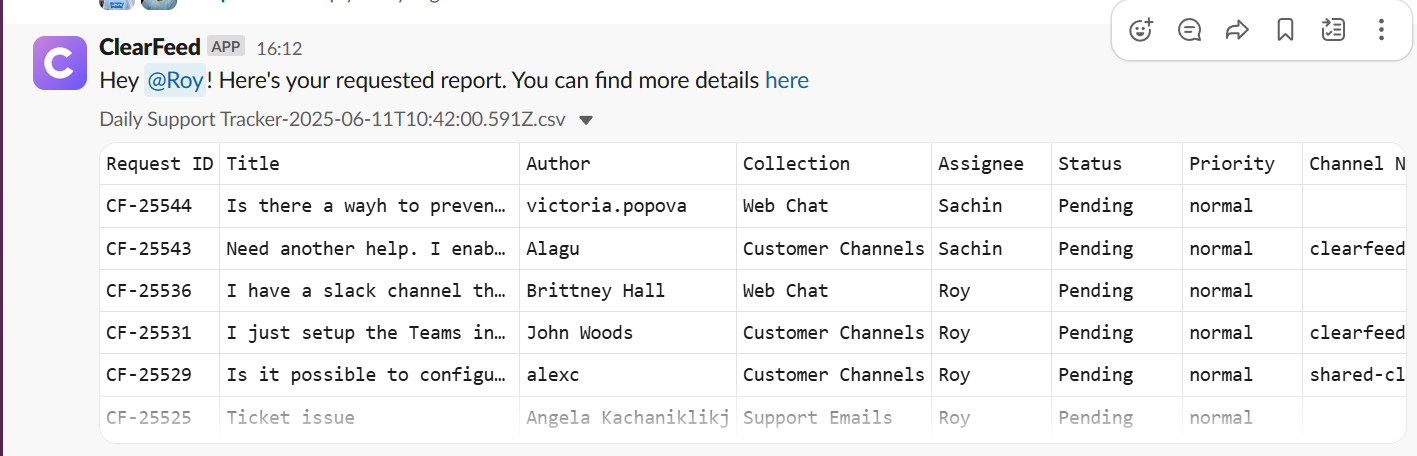 You can now schedule periodic reports from your saved Views in ClearFeed and automatically receive them in a Slack channel of your choice. This helps your team stay on top of critical ticket metrics—such as unassigned or aging requests—without needing to manually check every day.