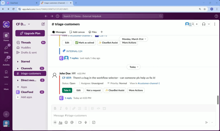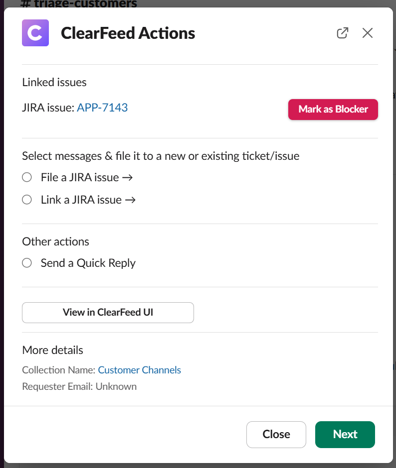 * **Maintain SLAs** in ClearFeed while tracking work externally