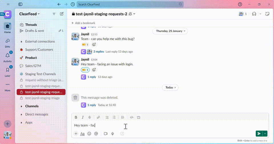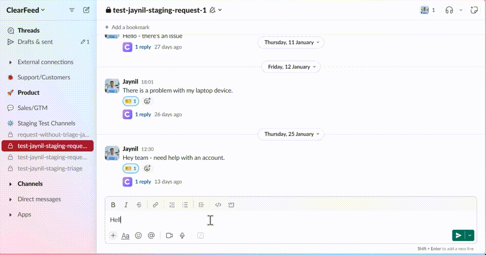 * Every new conversation (Slack thread) in the request channel is automatically converted into a ClearFeed ticket