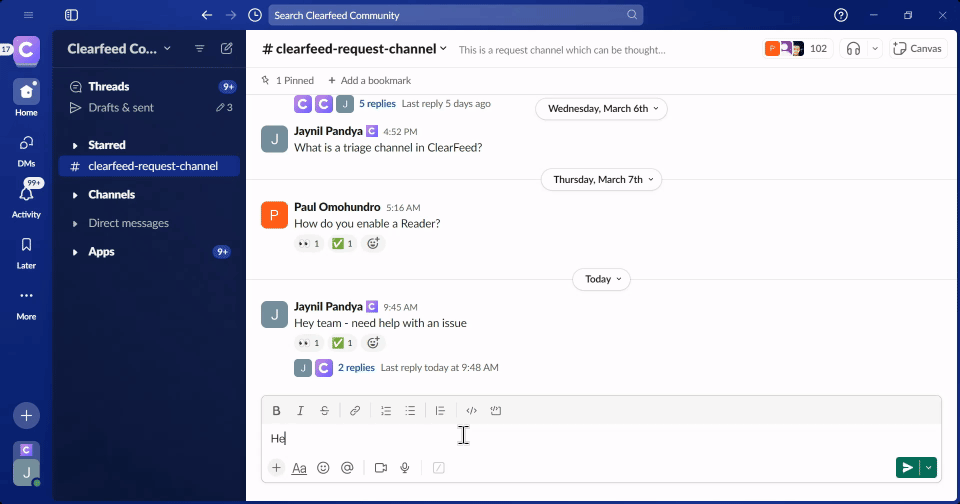 1. A user posts a message in a Slack channel monitored by ClearFeed