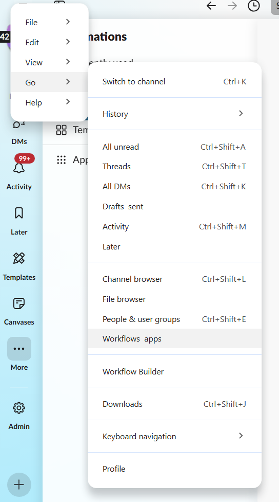 <figure><img src="https://3455705434-files.gitbook.io/~/files/v0/b/gitbook-x-prod.appspot.com/o/spaces%2FE2O2wTaNovd6fXpEuLKz%2Fuploads%2Fgit-blob-a69c94e00eb981ea79752b46d3ecaa491e484491%2Fwebhook-workflow-screenshot.png?alt=media" alt=""><figcaption><p>Slack Workflows Navigation</p></figcaption></figure>