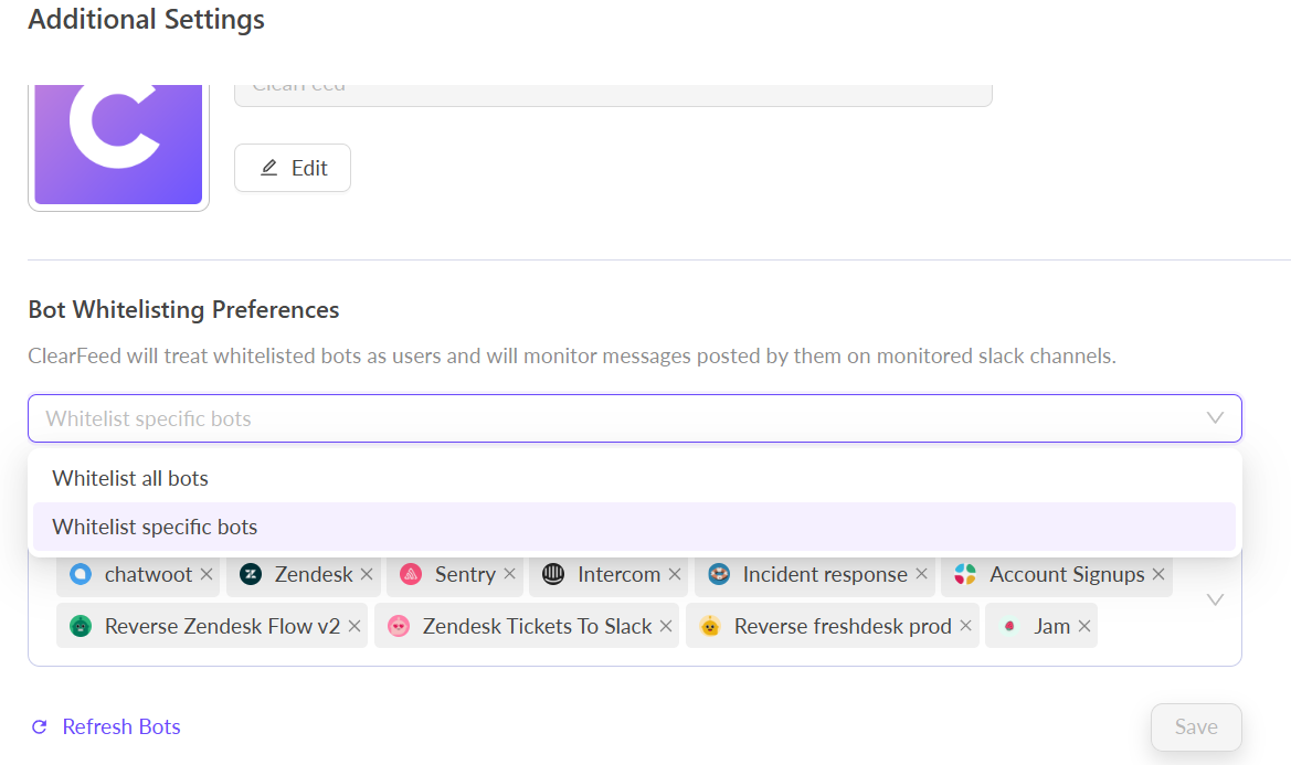 3. ClearFeed automatically detects the bots that are available in your Slack workspace.