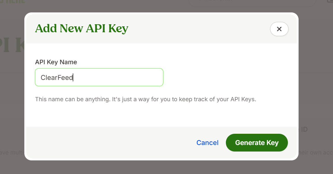* Provide a name for the key (e.g., *ClearFeed*) to help you identify its usage later, and click **Generate Key**.