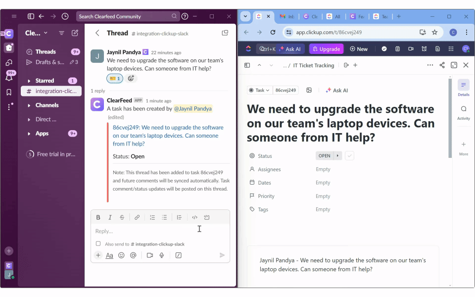 * Replies on the Slack thread and the ClickUp task are synced bidirectionally.