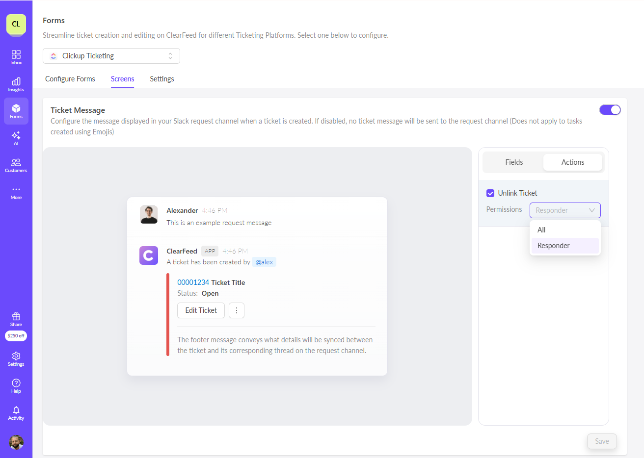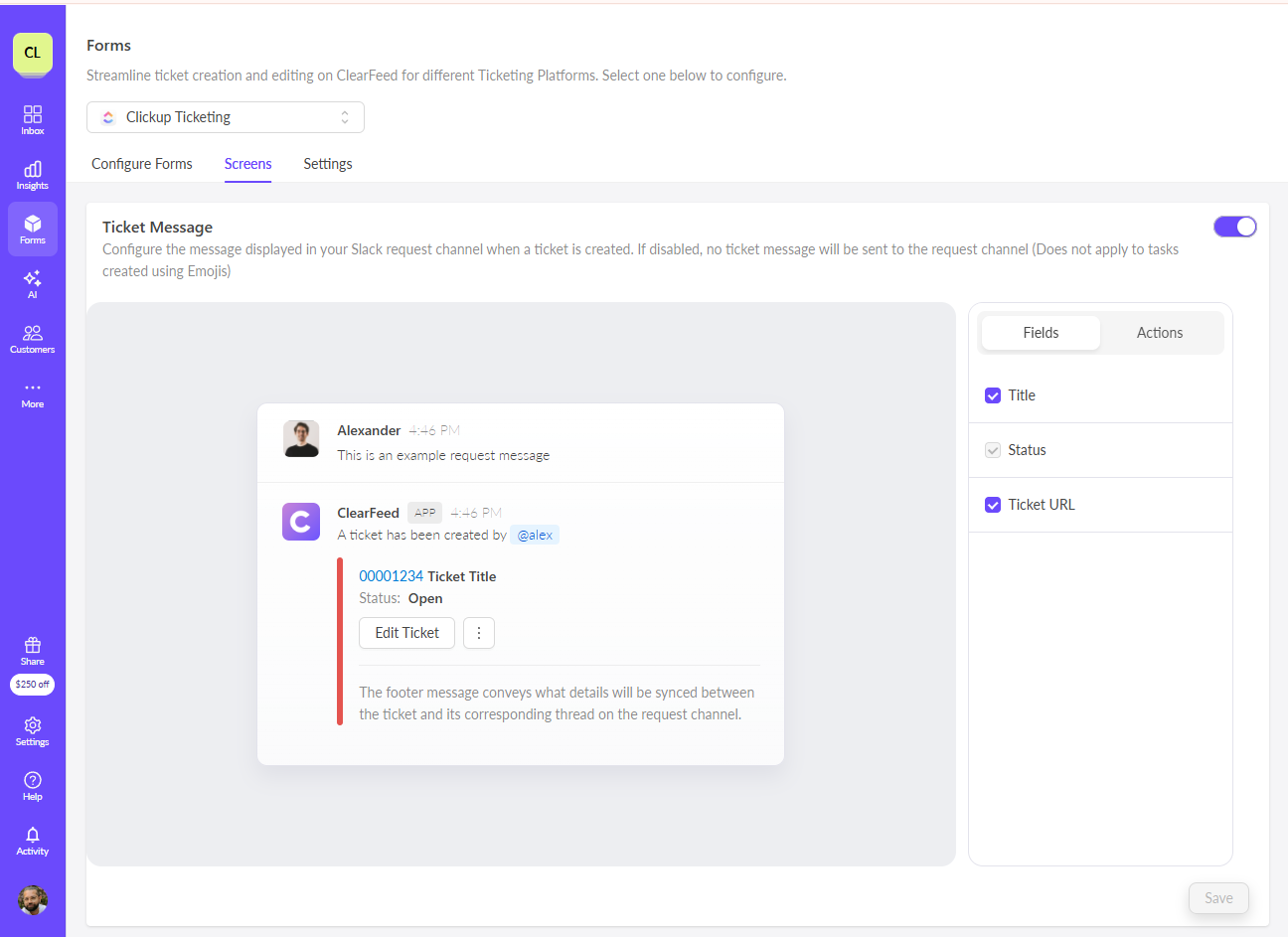 * You can completely disable the ticket message by toggling off Screens. This would mean that whenever a ClickUp ticket is created, users will not see any confirmation message and ticket details.