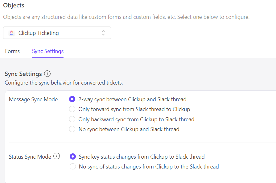 Sync settings allow you to choose whether messages are synced bidirectionally or in a single direction. Additionally, you can decide if updates to the linked ticket's status are shared in the Slack thread.