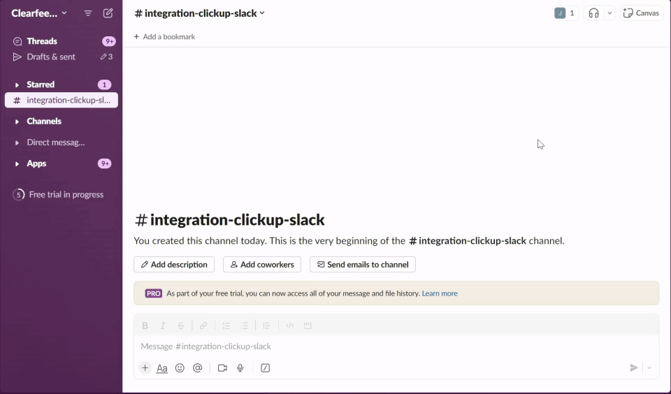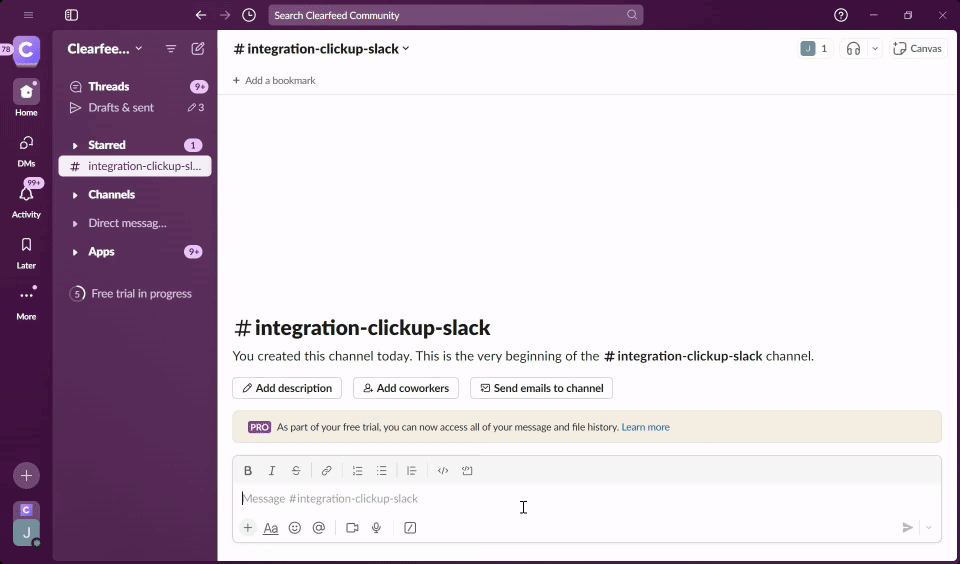 1. **Create a dedicated Slack channel** for ClickUp→Slack notifications (or reuse an existing one), and **monitor** it in ClearFeed.